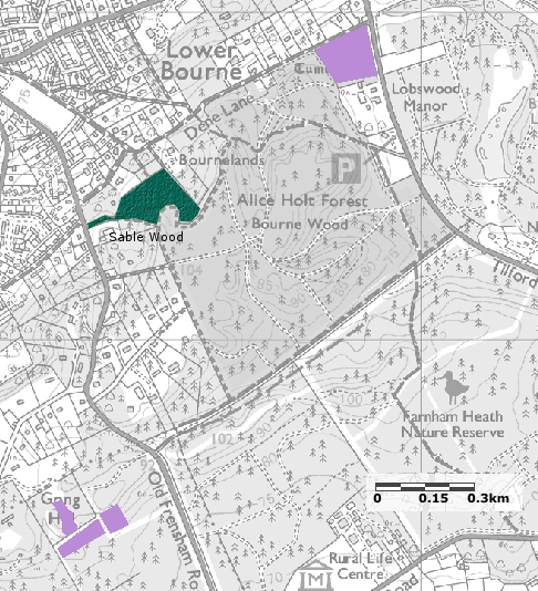Areas formally designated as lowland heathland (shaded purple) in the vicinity of Sable Wood (shaded dark green). Source DEFRA MAGIC website. Subcompartment Com 1 within Sable Wood contains a residual area of heathland that the management plan aims to protect and extend.