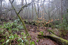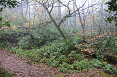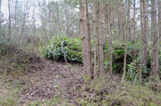 Before clearance, the trees were surrounded by rhododendron. Gaultheria extended beyond the mound on the left. All the cuttings have been piled on top of a further area of gaultheria, with the intention of weakening it.