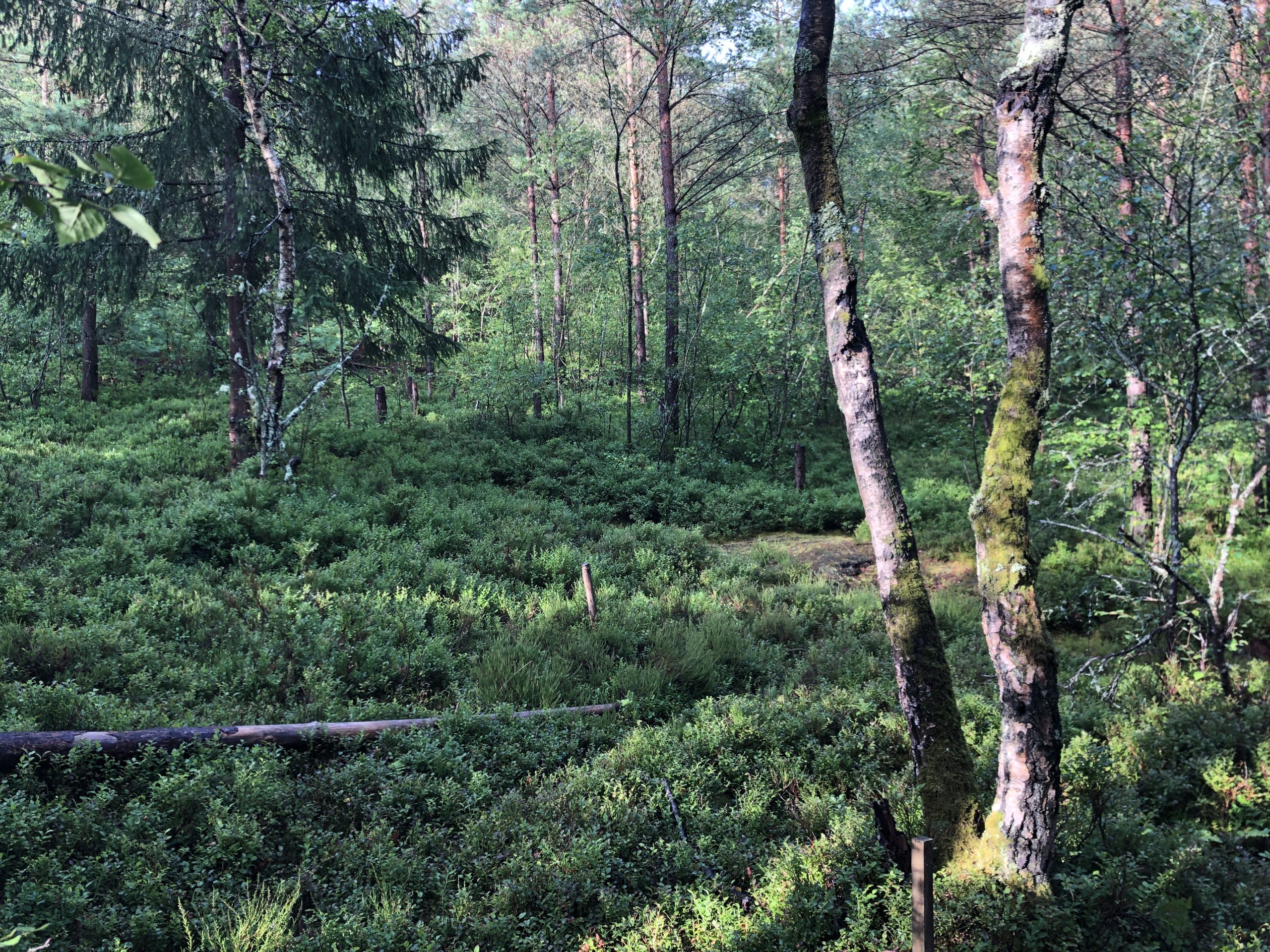 This area in sub-compartment Com 1 was once heavily shaded with Scots pine and birch, and invaded by gaultheria. Heather and bilberry are growing strongly now, forming a dense vegetation mass providing cover and habitat for reptiles and insects.