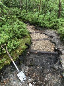 Rain erosion of footpaths is a recurring theme because of the sandy soil and significant slopes in Sable Wood, but it is relatively easily checked by adding log steps to interrupt the free flow of runoff.