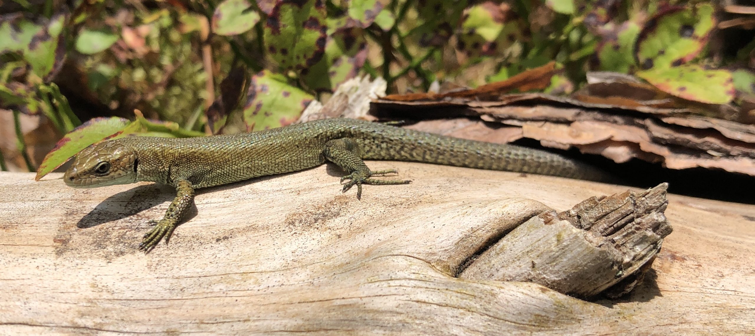 This common lizard (Zootoca vivipara) emerged from the vegetation in this area to settle on a log on 17 August. Common lizards seem relatively tolerant of human presence.