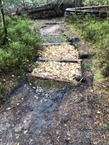 During the 2023/24 winter the top section of Marjorie’s Path began to show signs of serious erosion. Over several visits to the wood in the spring and summer of 2024 , successive logs were laid crosswise to form low steps, with the spaces filled with rubble and top dressed with wood chippings.
