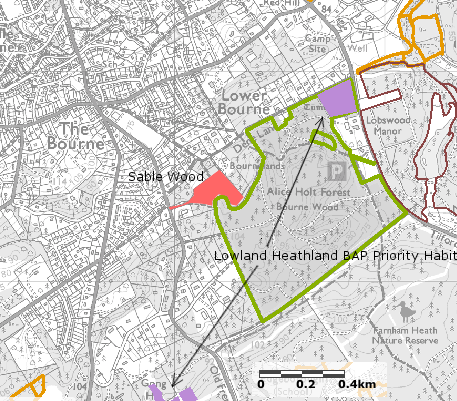 Lowland heathland is a priority habitat under the UK’s Biodiversity Action Plan. In the neighbourhood of Bourne Wood there are small and fragmented areas of lowland heath (marked as purple on the accompanying map). Sub-compartment Com 1 within Sable Wood contains some heath. Though small it is known to provide a home for adder and slow-worm.